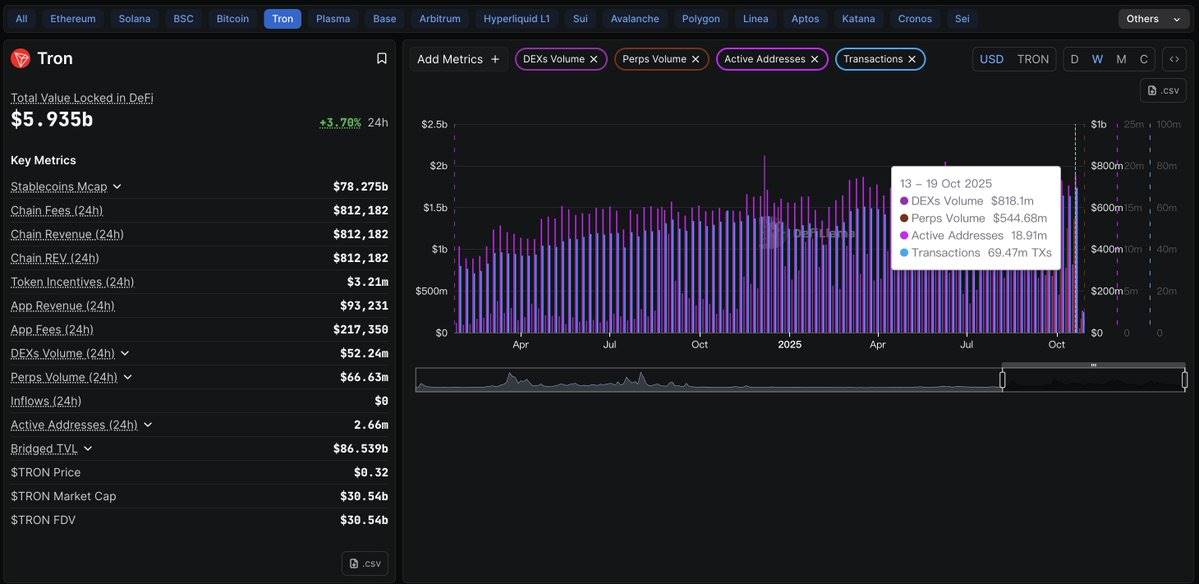 数据显示,TRON在DEX和永续合约市场多项数据逆势增长