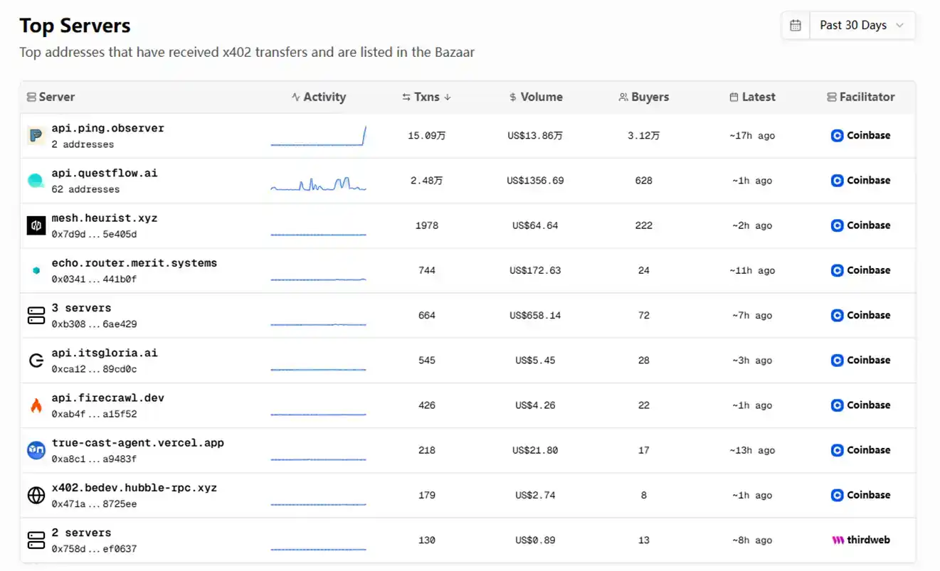 Regardless of how the market views the rapid surge of $PING, it has indeed opened up recognition for the x402 protocol among players in the community. Before the surge of $PING, data from the x402 ecosystem over the past 30 days showed that the minting interface for $PING received over 150,000 x402 transactions, amounting to approximately $140,000, far surpassing the second-ranked Questflow, which had only 24,800 transactions and less than $1,400 in volume.