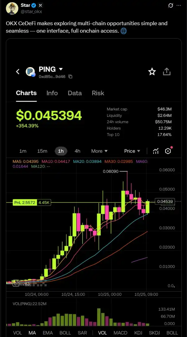 The drive of meme coins relies on market sentiment. After a tweet from OKX CEO Star featuring a screenshot of $PING, the lack of more sentiment-driving tweets in the short term made $PING's retracement understandable.