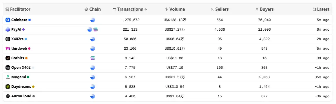 This is mainly due to two factors. The primary reason is that Payai is currently the second-largest Facilitator (verification and settlement service provider on the x402 protocol chain) after Coinbase:
