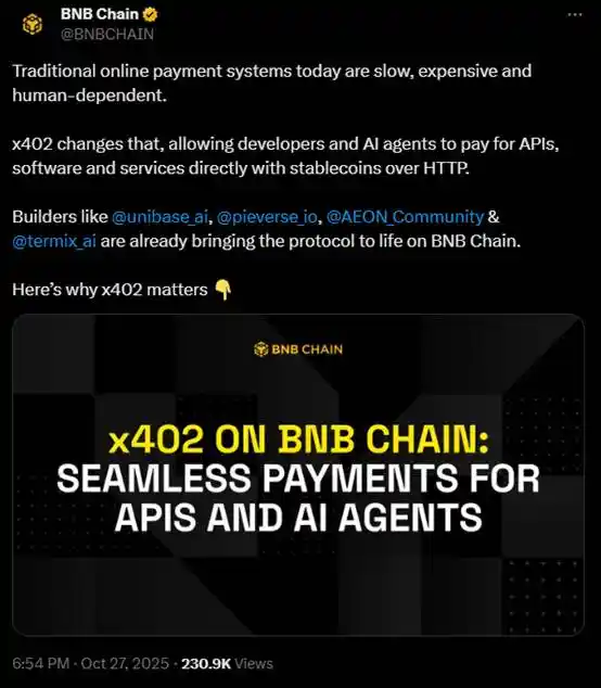 The official BNB chain Twitter also promoted four x402 protocol-related projects on BNB chain yesterday: Unibase, pieverse, AEON.xyz, and TermiX AI.