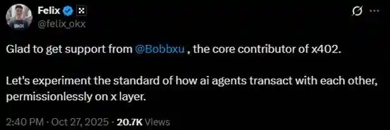 Felix Fan, head of the OKX Web3 wallet mobile team, tweeted yesterday that he received support from Bob Xu, a core contributor to the x402 protocol, to explore permissionless transactions between AI Agents on the X Layer: