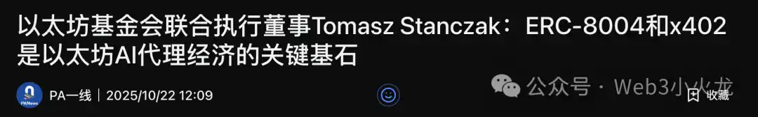 The strategic positioning of the Ethereum Foundation was clearly articulated at the ETHShanghai 2025 conference. Co-Executive Director Tomasz Stanczak revealed the infrastructure blueprint for the future AI agent economy: ERC-8004 as the standard for agent functionality, covering identity, reputation, and claim verification; while x402 specifically defines the payment protocol between agents, together forming the technical foundation of the autonomous machine economy.