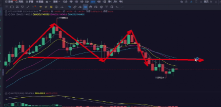 那我们往下去看的话可以看到4小时级别,其实连续的14根阴线往下去砸,目前来说是已经砸到了支撑的位置,下方的支撑位有两个,上方的压力位有两个一个是113,200,一个是111,600,现在已经非常接近,我们113,200的支撑位置就是前面的颈线支撑位置。