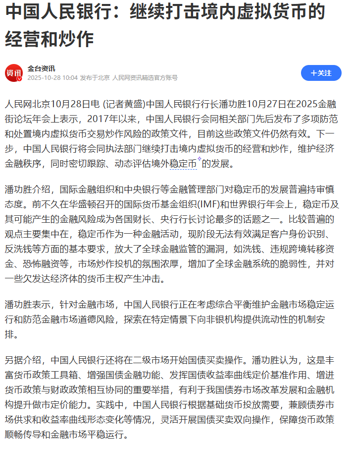 On October 27, during his speech at the 2025 Financial Street Forum Annual Meeting, Pan Gongsheng, the Governor of the People's Bank of China, reiterated the ongoing crackdown on the "operation and speculation" of virtual currencies within the country. Upon seeing this news, Lin Chao received two private messages from fans asking whether this would impact the market and if it would become more difficult to invest in cryptocurrencies in the future. In fact, after decades of various policy experiences, the situation has remained largely the same year after year. When the market is performing well, some policies will be introduced to curb speculative sentiment, mainly serving as reminders for newcomers who have not yet entered the market. Personally, I have not been paying much attention to these policies, focusing instead on the market itself. However, many people still struggle to interpret these policies objectively. Therefore, today Lin Chao will summarize the core information from this speech, its potential impact, and possible responses from market participants.