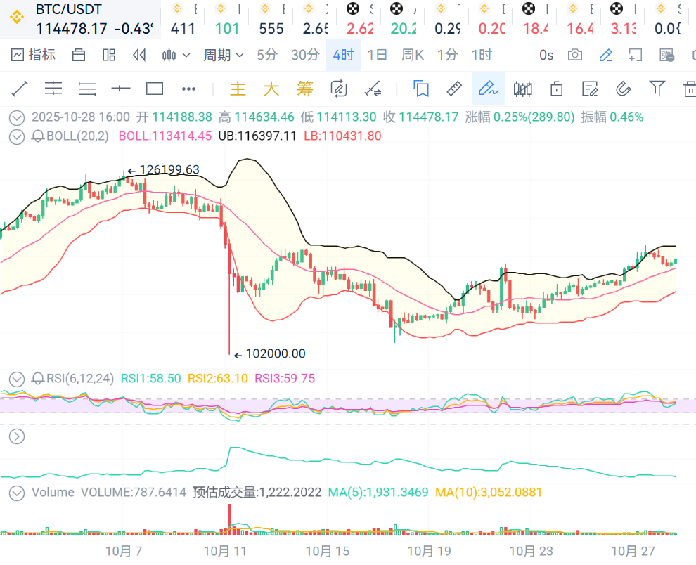 BTC:4小时级别看,价格继续保持在布林线中轨之上,价格走势依旧健康。