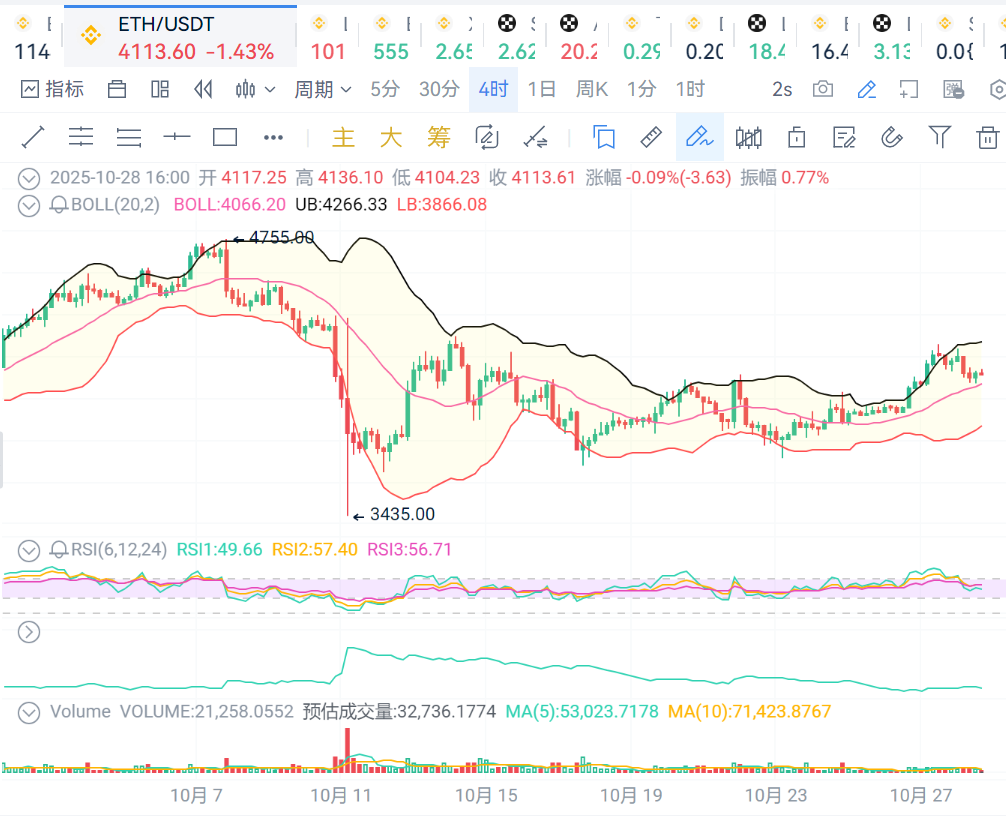 ETH:4小时级别看,价格继续保持在布林线中轨之上,价格走势依旧健康,支撑位4100,压力位4130.