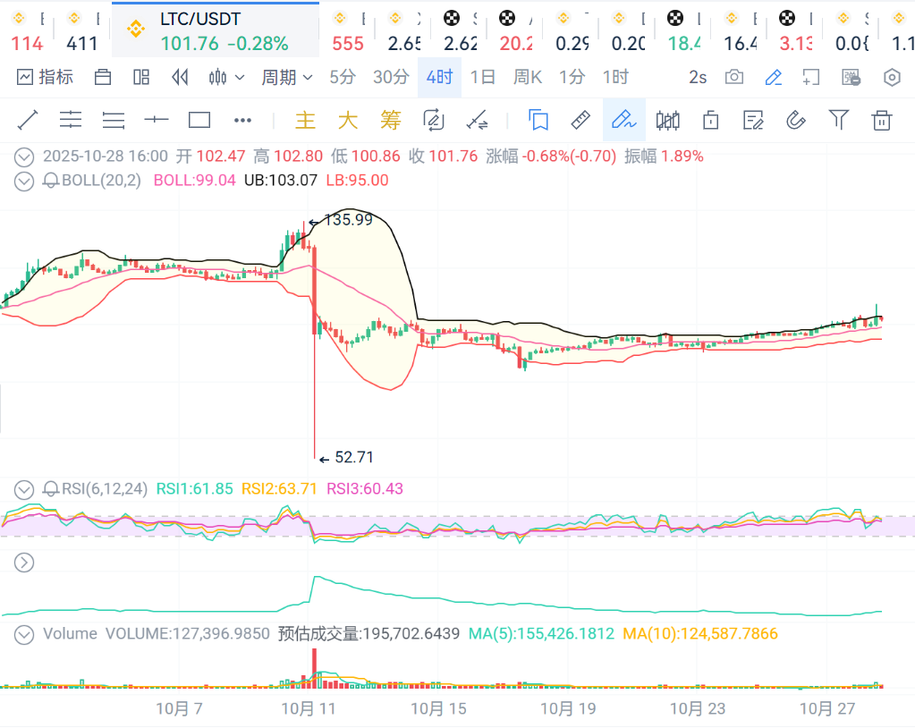 LTC:价格继续保持在布林线中轨之上,价格走势依旧健康,支撑位100,压力位103.