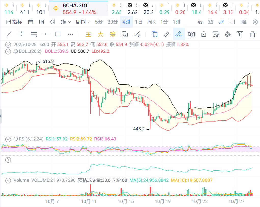 BCH:价格继续保持在布林线中轨之上,价格走势依旧健康,支撑位540,压力位570.