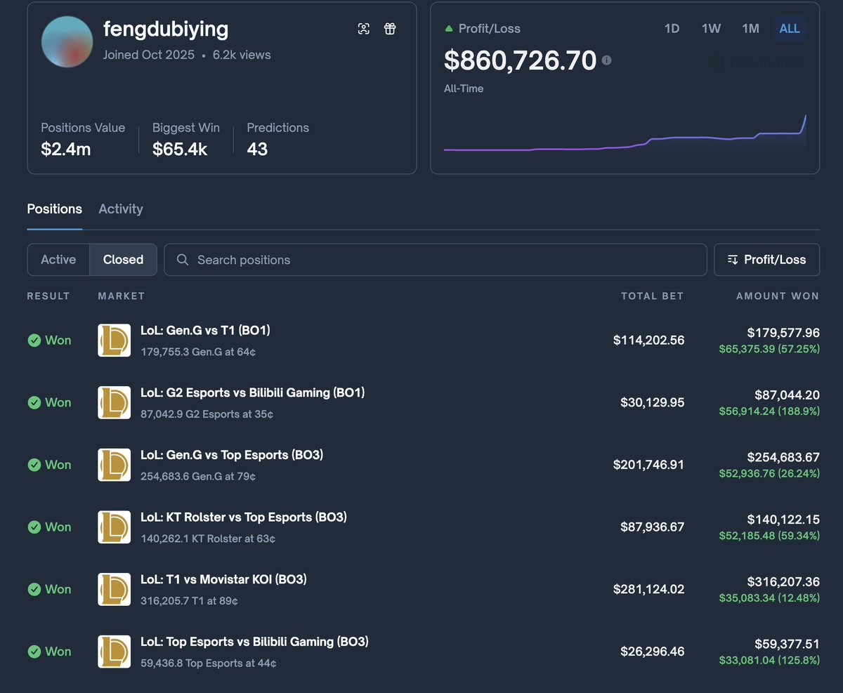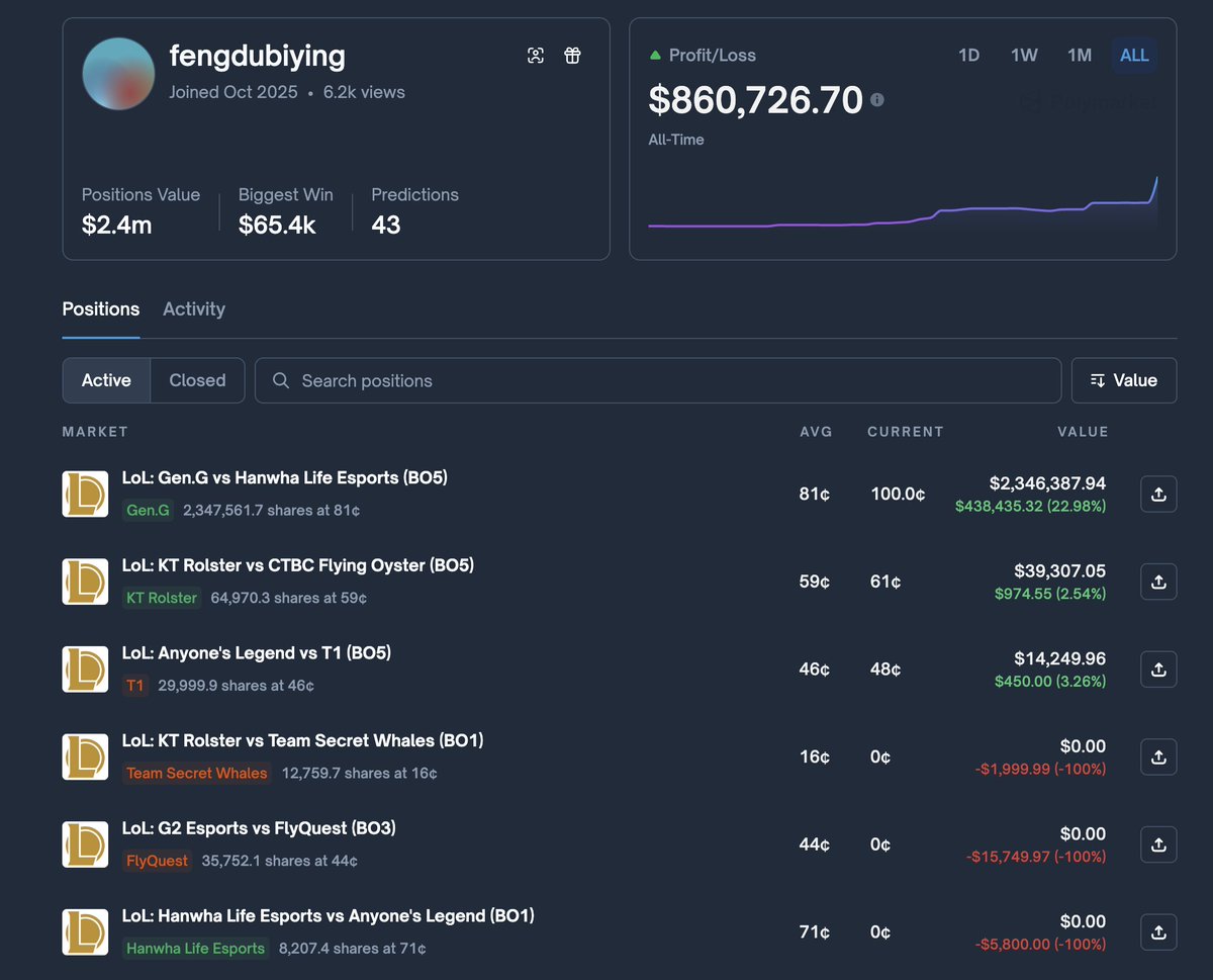 看了下今天下重注(190万美金)押注Gen战胜Hanwha的Trader,从10月份开始玩Polymarket,基本只押注了LOL的S15世界赛,一个月赚了86万美元,胜率高达81% (35/43).