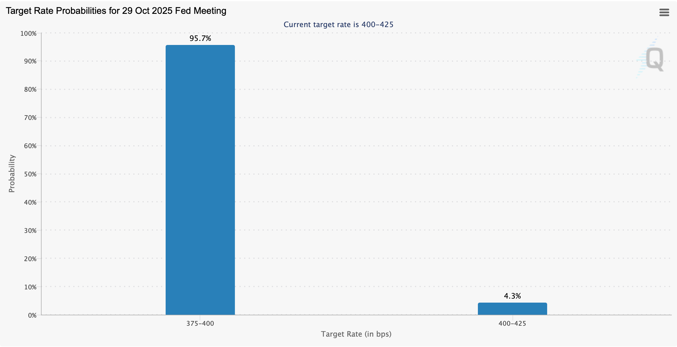 Joining the chorus, CME’s Fedwatch tool pegged the odds of a quarter-point trim at 95.7% as of 12:30 p.m. Eastern time on Oct. 28. The tool crunches federal funds futures prices to reveal what traders really think the Fed will do next—and right now, nearly everyone’s betting on a gentle slice, not a shock. There’s still a slim 4.3% chance the Fed holds steady.