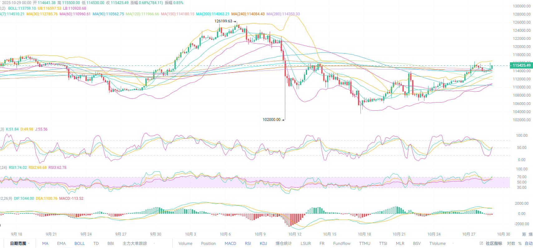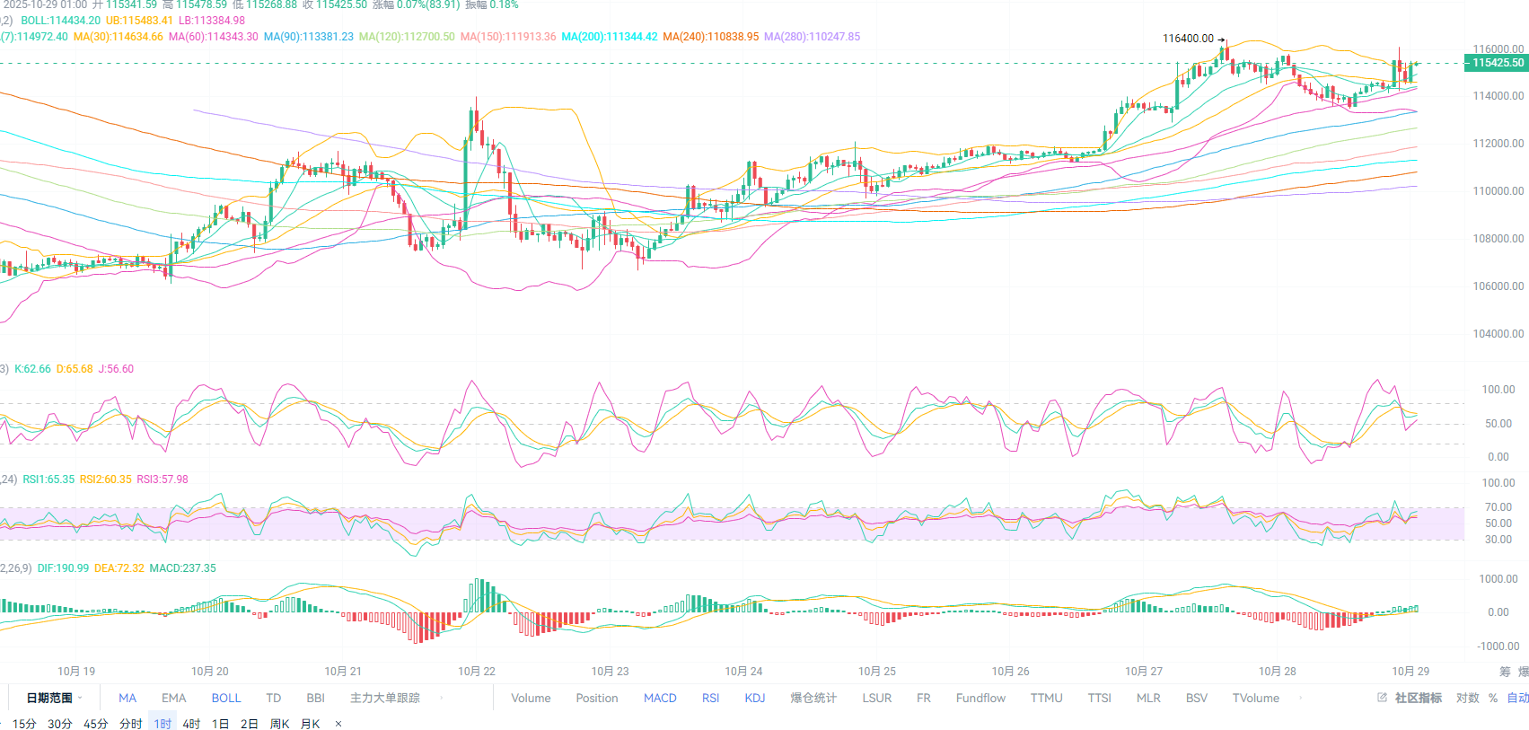比特币现价115400附近,目前行情位于1H图中BOLL通道上轨位置,日内行情冲高116000就迅速回踩中轨与MA60区间支撑继续向上,MACD中绿柱再次出现放量,DIF与DEA在短暂继续开口向上,KDJ与RSI再次拐头向上,下方继续中轨与MA60二次支撑可低多布局。
