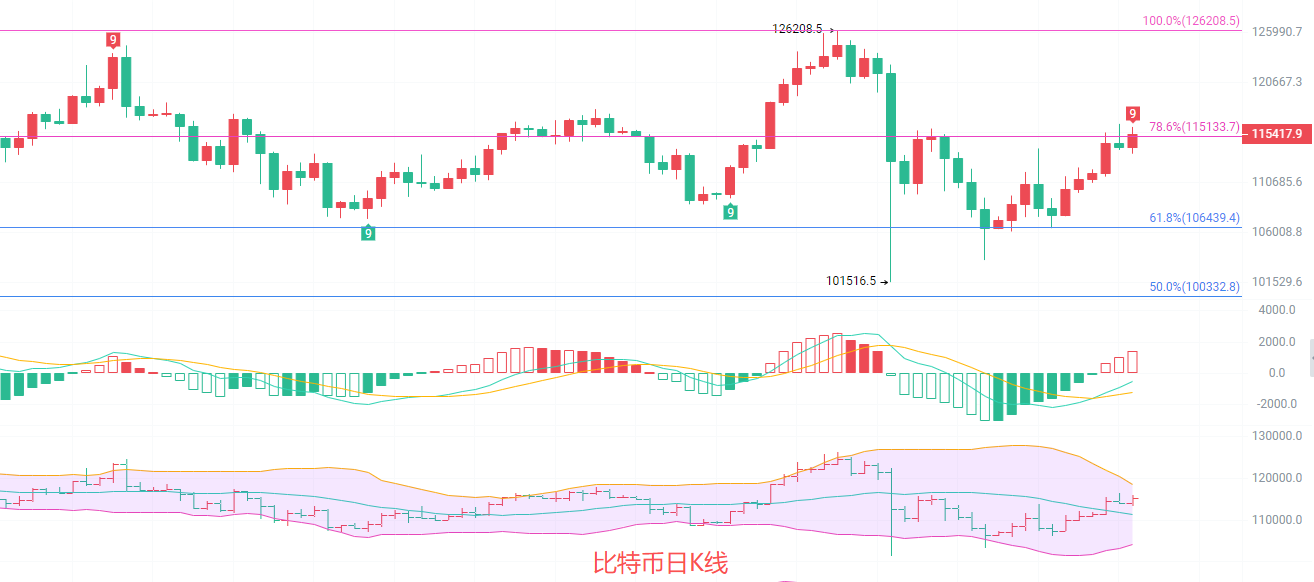 发稿前日K线最高116075,最低113422,日线回踩EMA60趋势支撑113435之后回拉破了786分割线阻力,多头延续,MACD连续放量拉伸,DIF和DEA向上金叉扩散,布林带收缩以后上轨下移到了118750,中轨也在下移,来到了111500,整体趋势上可以看到多头还有空间没有走完,依旧有动能上拉