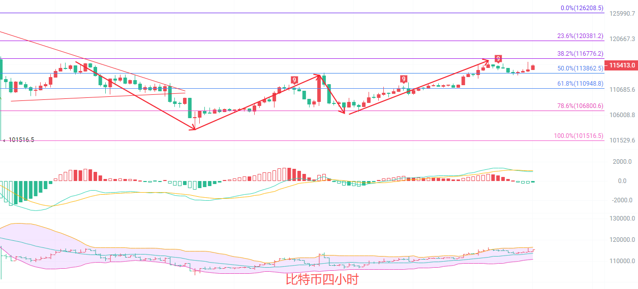 四小时K线四连阳,开始冲击前高116380,至于是否能够成为双顶的空势还需要等待信号出现才能决定,至少目前依旧是多头趋势,MACD顶部背离的行情,说明还有冲击前高的动能存在,DIF和DEA在高位收缩再破前高的话就会形成强势多头,布林带向上拉伸,上轨来到了116560,中轨支撑关注113700,思路上回踩以后北上为主,南下等待拉伸结束再决定