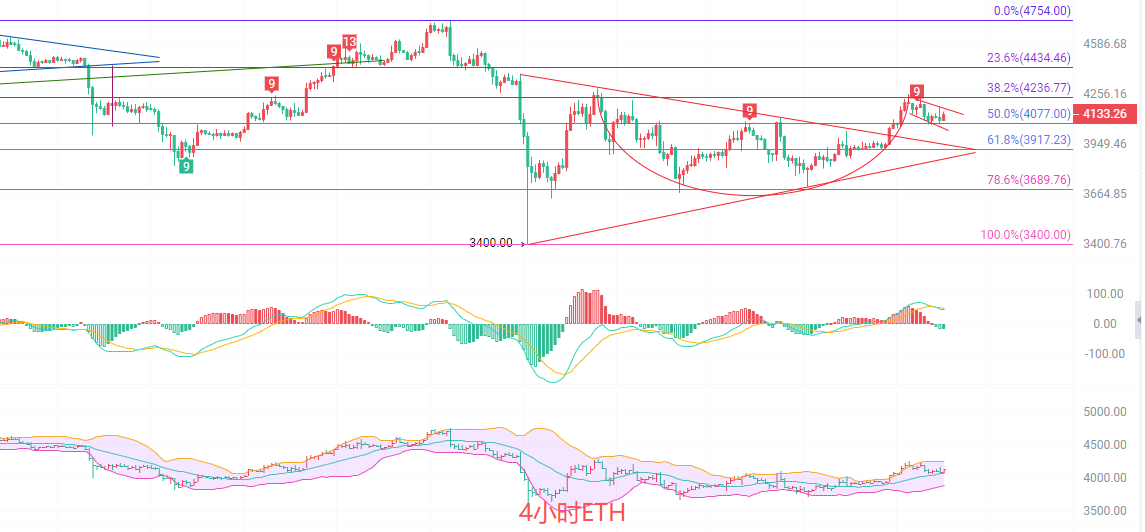 四小时K线U形过度以后形成壶嘴形态,回踩分割线0.5一线横盘支撑位关注4075,MACD顶部别理缩量上行,加上壶嘴形态,说明行情短期内还有一波拉伸,并且冲击前高4250,所以在4070附近北上的币友可以继续持有,短线布林带上轨关注4265,可以作为北上止盈目标位,至于南下要等多头动能结束以后的盘口在决定
