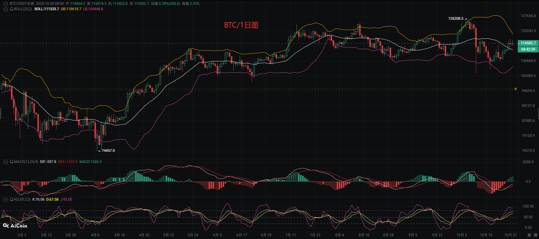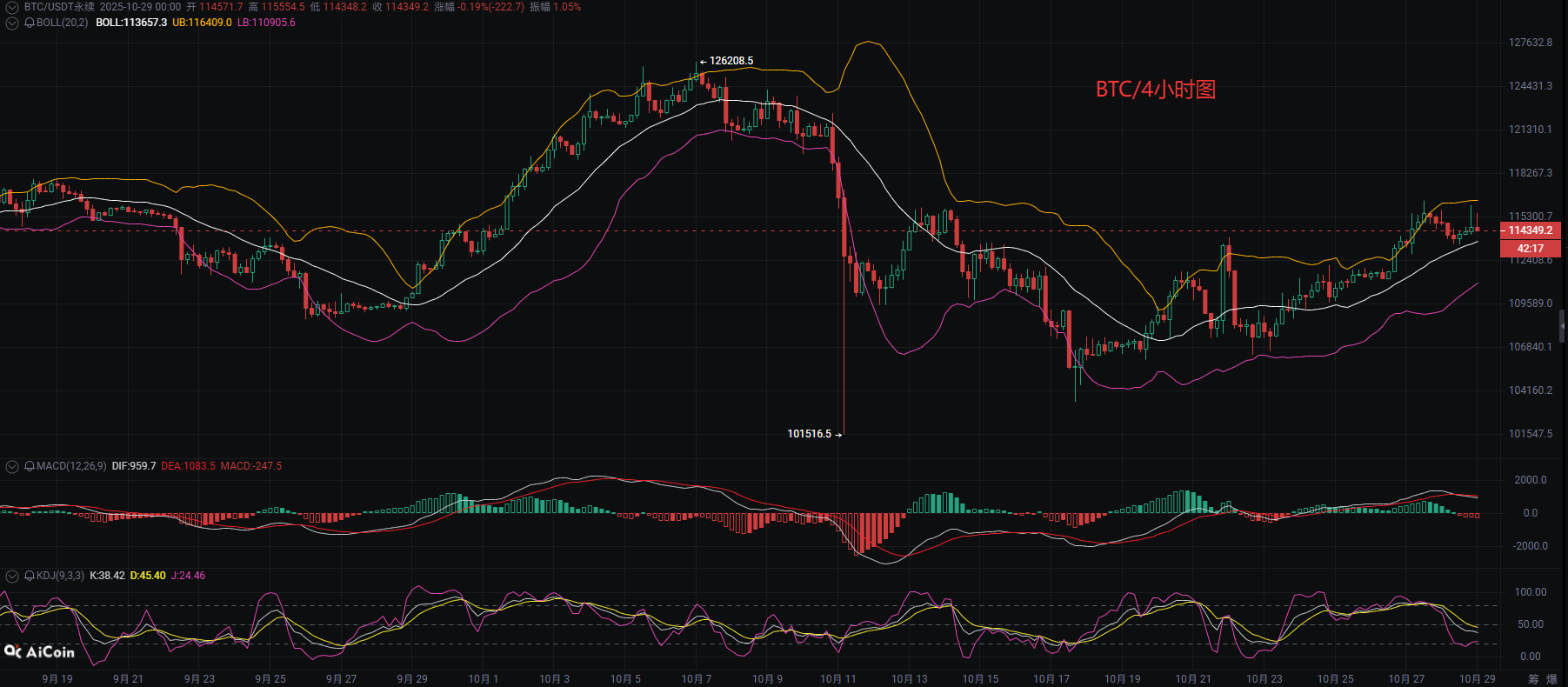 短周期小时图上看,行情是冲高触及116380位置承压回调,短期价格向下试探,目前跌幅已经超过2000多点,低位来到了113500下方区域,走势上看多空来回穿插,短时间波动较大,后续重点关注111500下轨支持,没有跌破预计行情将会走出反弹,短期价格有望上行继续测试116000一线。反之若是后续跌破111500一线,价格有向下破的风险,望各位币友提前做好准备。短期上方压制还是关注116000位置附近企稳情况。