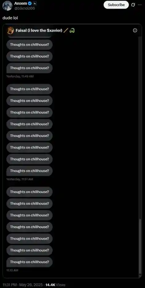 The "text bomb" ultimately brought Ansem out, and "Thoughts on chillhouse?" became a meme in the Solana ecosystem. Now, when you see players in the comment section randomly saying "Thoughts?" in both English and Chinese, it is actually a simplification of this meme. The meme does not genuinely seek KOLs' opinions on Chillhouse; it is more of a "sticky candy" way to attract attention, like when my friend asks me how the weather is, and I immediately respond with three questions, "What do you think of Chillhouse?" regardless of the audience or context.