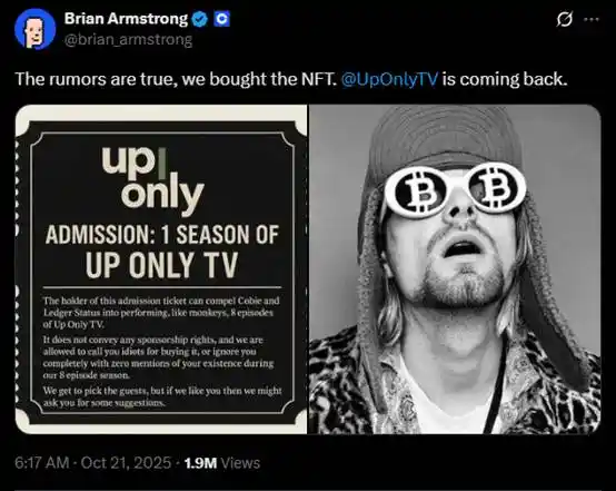 On October 21, Coinbase spent 25 million dollars to purchase the UpOnly NFT from Cobie. Subsequently, Coinbase CEO Brian Armstrong confirmed the authenticity of the news. Brian stated, "Holders of this ticket (NFT) can force Cobie and Ledger Status to perform like monkeys, recording 8 episodes of 'Up Only TV.' This ticket does not grant any sponsorship rights, and we reserve the right to call you 'the fool who bought this thing,' or completely ignore your existence — not mentioning you at all throughout the 8 episodes. Guests will be decided by us, but if we find you interesting, we might consider your suggestions."