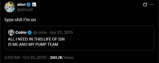 On October 22, alon retweeted a post from Cobie dating back to 2015. Cobie's original tweet was, "In this sinful life, all I need is myself and my Pump team." Alon's quoted tweet was, "This is what I'm doing now."