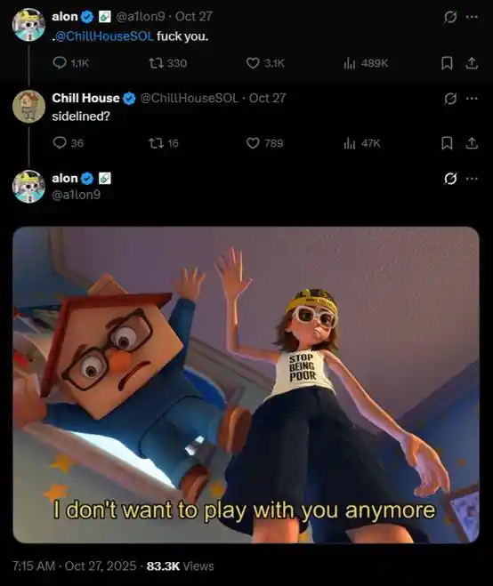 On October 27, Chillhouse continued its usual antics, "F* you, Toly, f* you, Mert (Helius CEO), f*** you, Solana Foundation."