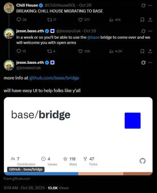 So what is Jesse's true intention? If we don't rely on speculation and only look at the public tweets, Jesse seems to want to attract quality meme communities and developers on Solana. In the tweet below, we can see that while Chillhouse is being erratic, Jesse seriously shared the GitHub page for the Base cross-chain bridge in the comments: