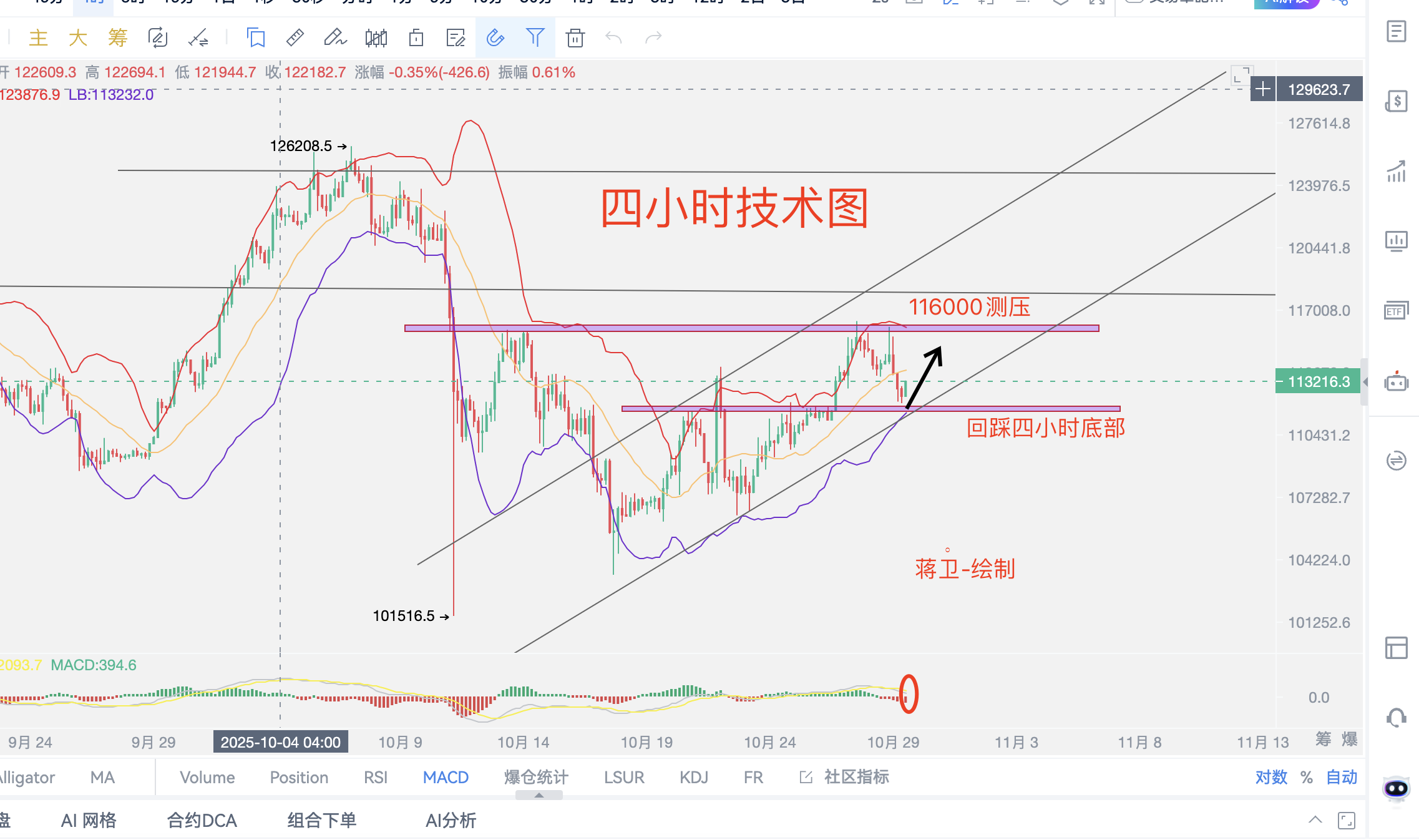 Currently, the four-hour level is showing an upward opening. After reaching the upper track yesterday, there were three consecutive bearish candles, and now it is starting to slowly rise and retrace. If the volume is sufficient, the price may return to the 116,000 mark after the evening session. As for whether it will continue to break through to new highs, it depends on the situation at that time. If it can stabilize and close above, then the current target remains at 116,000.