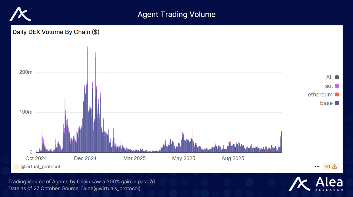 x402 is at the intersection of the agent economy and the AI Memecoin supercycle from Q4 2024 to Q1 2025. Virtuals and its Virtuals agents have seen a massive increase in trading volume after integrating x402 functionality.