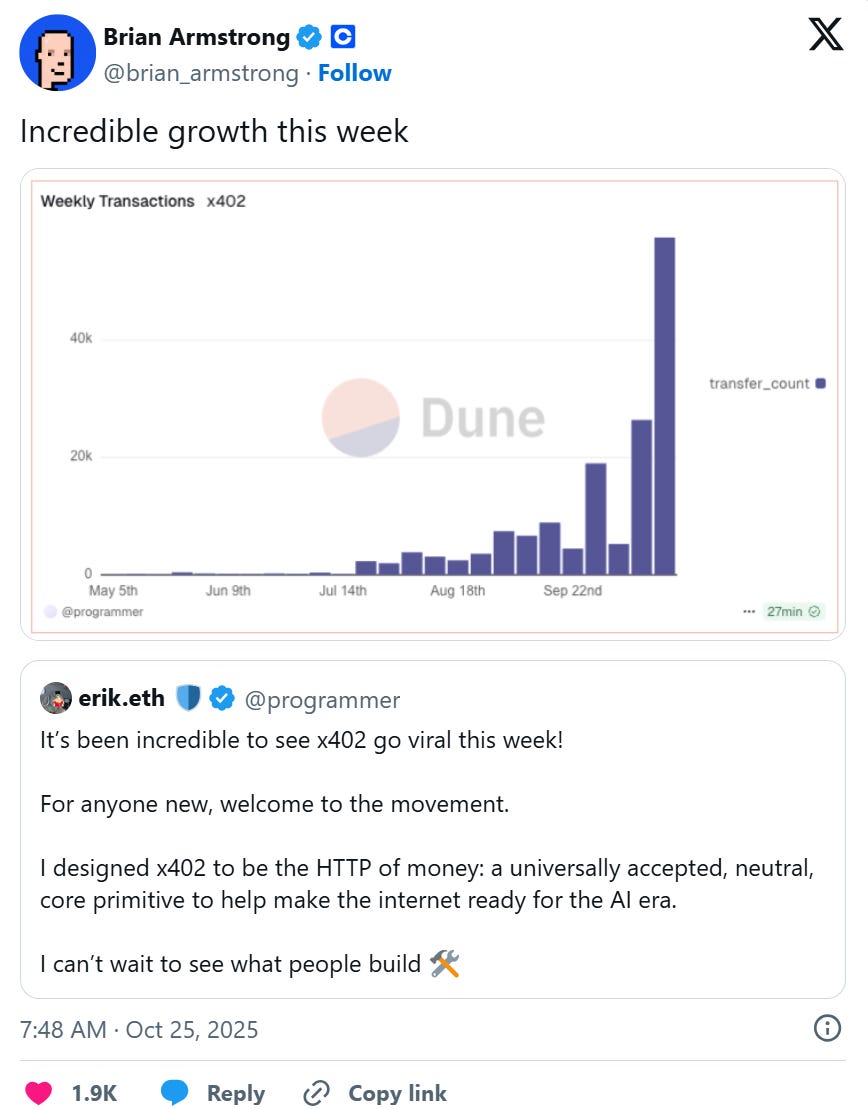 Adoption metrics show that x402 transaction volume approached 1 million transactions last week.