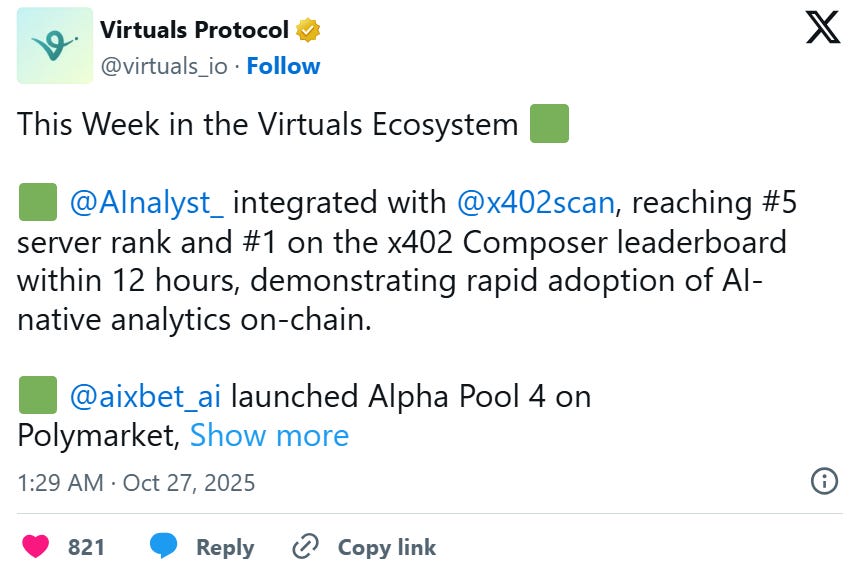 Virtuals has integrated its Agent Coordination Protocol (ACP) with x402 to handle hosting, verification, and on-chain settlement. We are seeing many new and existing agents adopting this technology to enable micropayments in agent commerce.