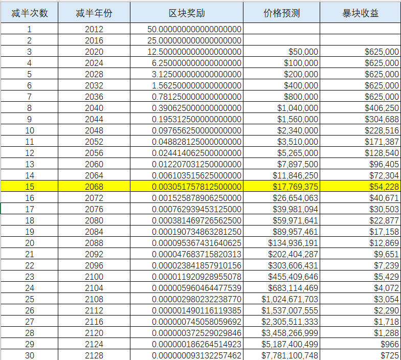 In 2068, when I turn 100 years old (assuming I live as long as Yang Zhenning), the block reward for BTC will be 0.003 BTC. Based on the average inflation rate in the United States, the price of BTC will reach around 18 million per coin at that time, making the block reward approximately 60,000 USD. Considering inflation, even 60,000 USD may not be enough to cover electricity costs.