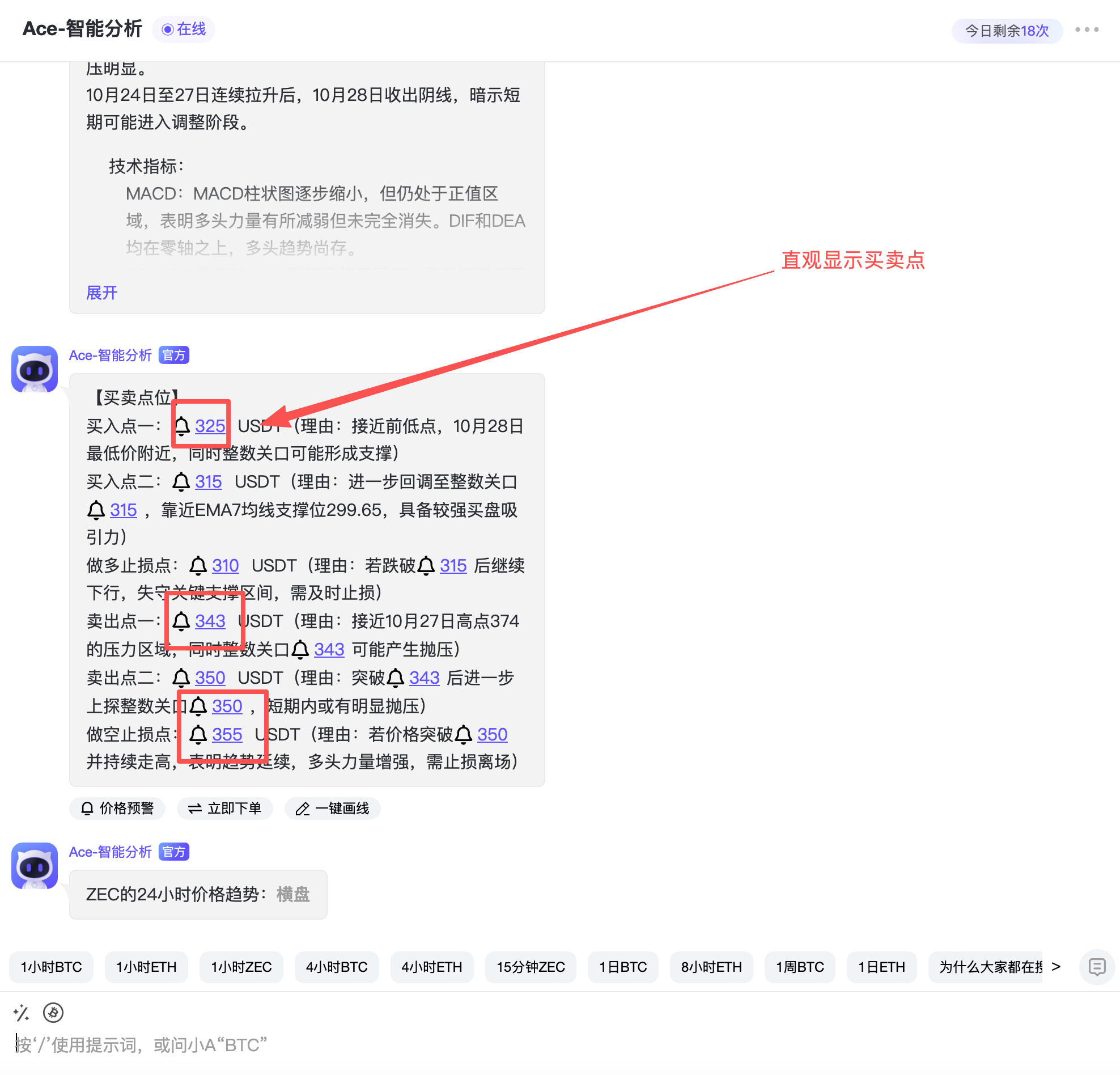 2. 策略规划 → 给你“傻瓜式”买卖计划 ,AI 直接出 买入/卖出/止损 点位 + 大白话理由!ZEC 24小时策略示例: