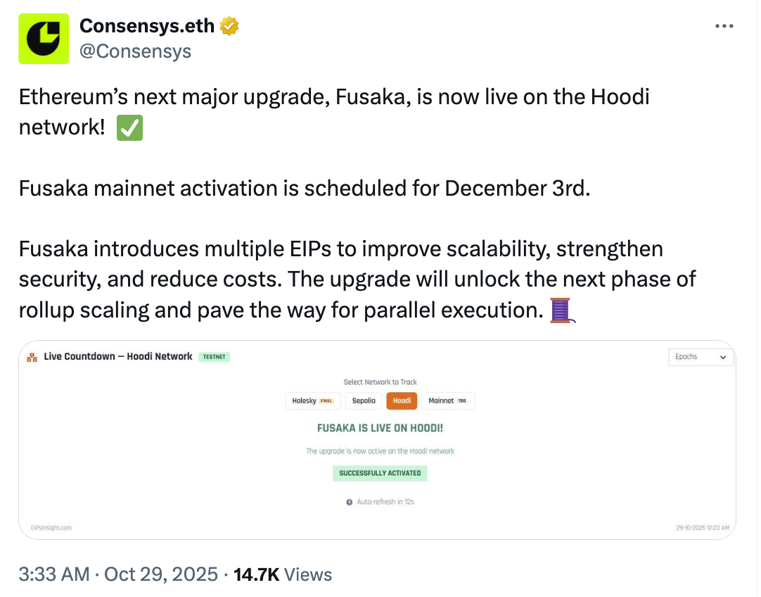 Yesterday, the Fusaka upgrade was successfully activated on the final testnet, Hoodi. As the last hurdle before mainnet activation, this means that Fusaka will officially launch as scheduled by the end of the year. Prior to this, Fusaka was successfully deployed on the testnets Holesky and Sepolia on October 1 and October 14, respectively. According to the established plan for the Fusaka upgrade, it requires at least 30 days of testing before the mainnet launch. Based on this, core developers have tentatively set the launch date for December 3.