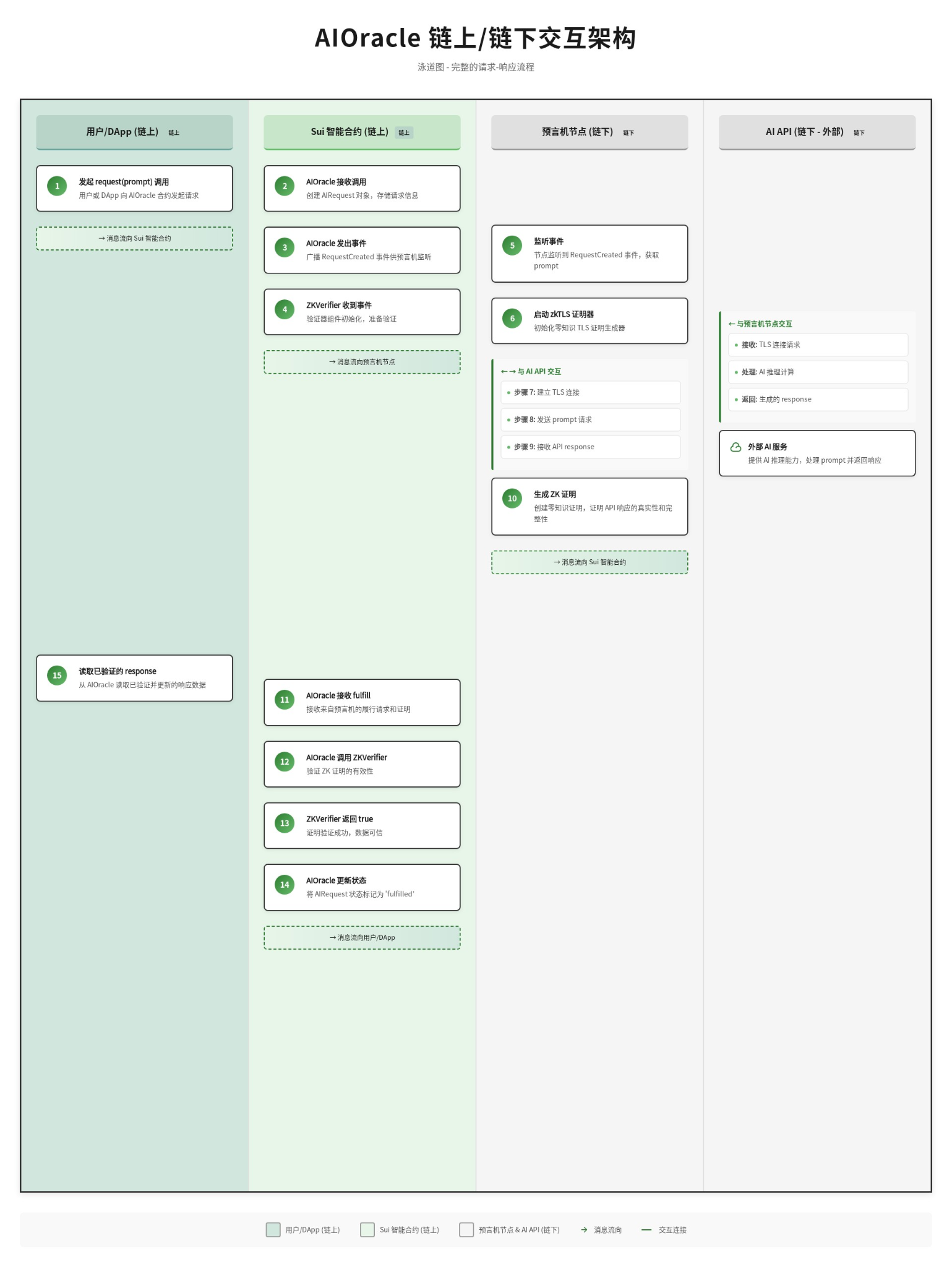 The following diagram illustrates the complete interaction architecture between AI Agents, Sui smart contracts, off-chain nodes, and external AI APIs: