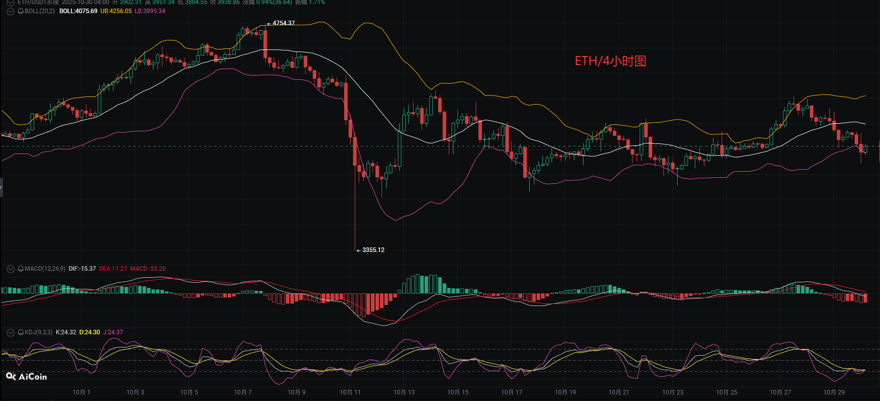 Against the backdrop of three consecutive daily bearish closes, the 4-hour chart shows key technical signals: after probing the bottom at 3840, the price formed a long lower shadow and quickly rebounded, indicating strong buying support below 3900, and it has not broken the previous low, forming a descending triangle consolidation pattern with recent highs. From a technical indicator perspective, the 4-hour MACD's DIF and DEA maintain a death cross below the zero axis, but the green bars have shortened, indicating a potential corrective rebound in the short term, with downward momentum temporarily weakening. At the same time, the current price continues to be constrained below EMA7 (3978) and EMA30 (4019), and the overall bearish arrangement of moving averages remains evident. The intraday rebound has not stabilized above 4000, and there is a trend of continued short-term correction. It is recommended to focus on short positions during the rebound.