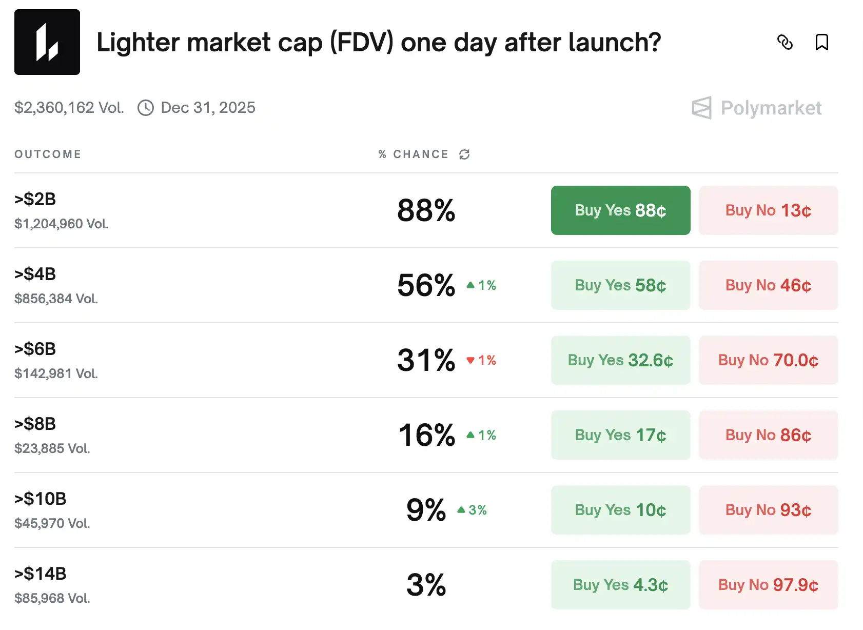 From market performance, predictions on Polymarket show that investors are highly optimistic about Lighter: there is an 88% probability that its FDV on the first day of launch will exceed $2 billion, and a 55% probability that it will exceed $4 billion. Meanwhile, prices in the over-the-counter (OTC) market remain stable at around $80.