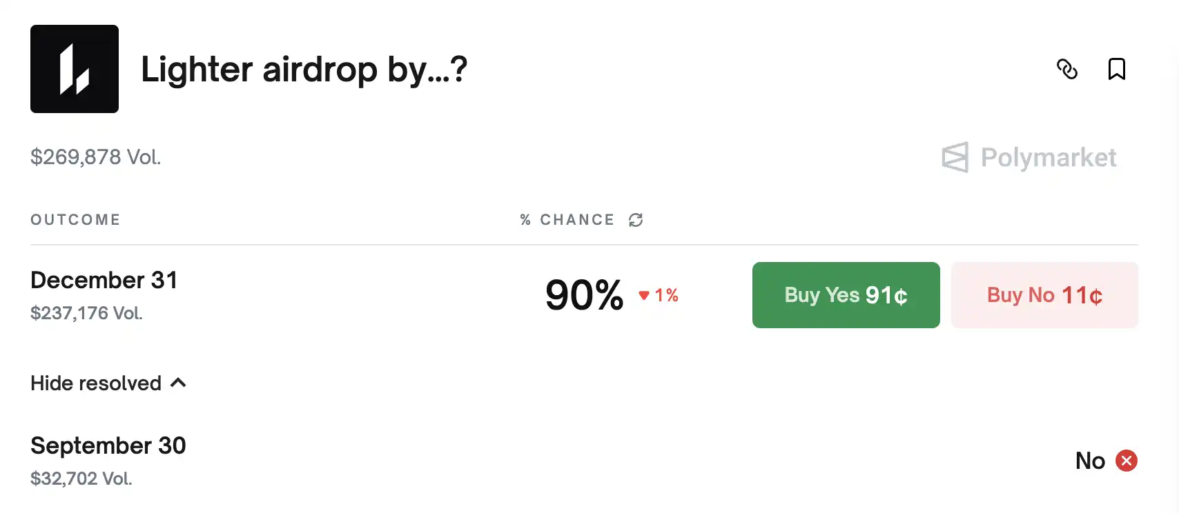 Data from Polymarket further supports this expectation, showing a 90% probability that Lighter will complete the airdrop before December 31. This means participants may receive the long-awaited token rewards before the end of the year.