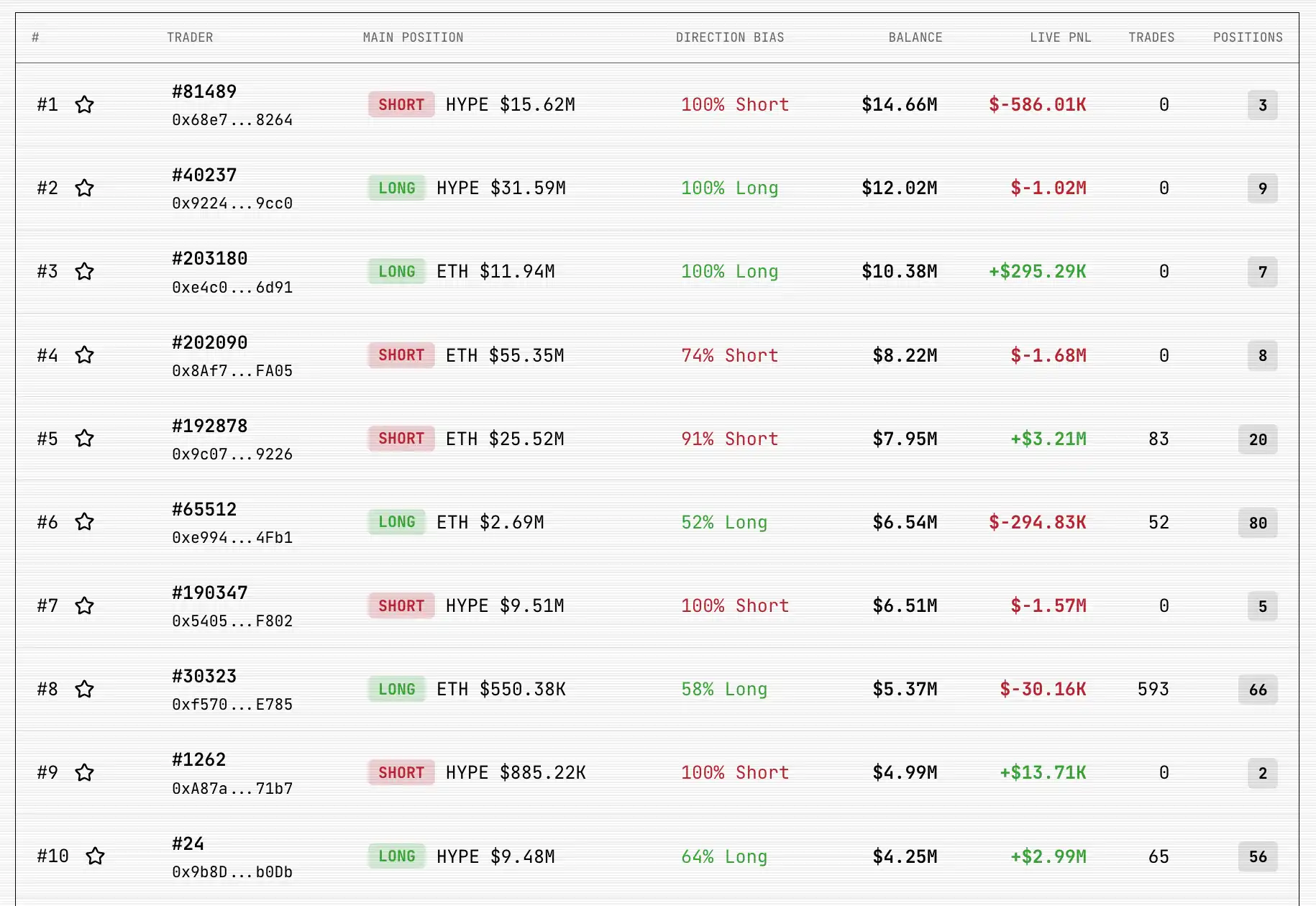 Lighter's top ten traders primarily focus on trading ETH and HYPE. The top trader on the leaderboard has a primary position in ETH shorts, with a total position value of $25.52 million, having realized a profit of $3.21 million, executing 83 trades, and holding 20 positions.
