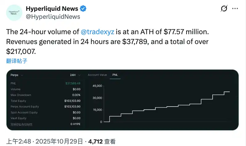 According to Hyperliquid News, trade.xyz set a new single-day trading volume record, reaching $77.57 million. It generated $37,789 in revenue within 24 hours, with total cumulative revenue exceeding $217,000. Based on current growth trends, some analysts believe that by Christmas, trade.xyz's trading volume will surpass that of established platform dYdX.