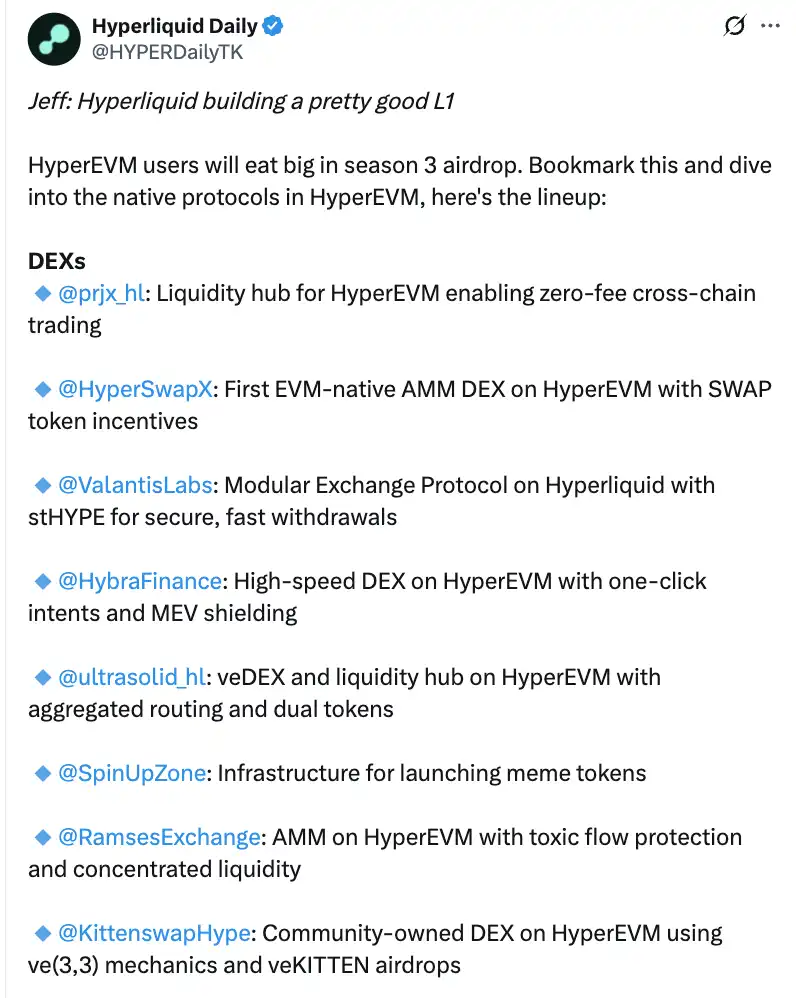 Hyperliquid Daily (@HYPERDailyTK) has compiled information on the HyperEVM native protocol, which is becoming an important choice for developers, ranging from DeFi protocols to innovative applications.
