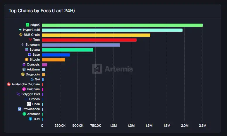 According to Artemis's "Top Chains by Fees" data, edgeX surpassed Hyperliquid with $2.3 million in 24-hour fee revenue, becoming the new king of on-chain fees, highlighting the platform's high trading activity and user stickiness.