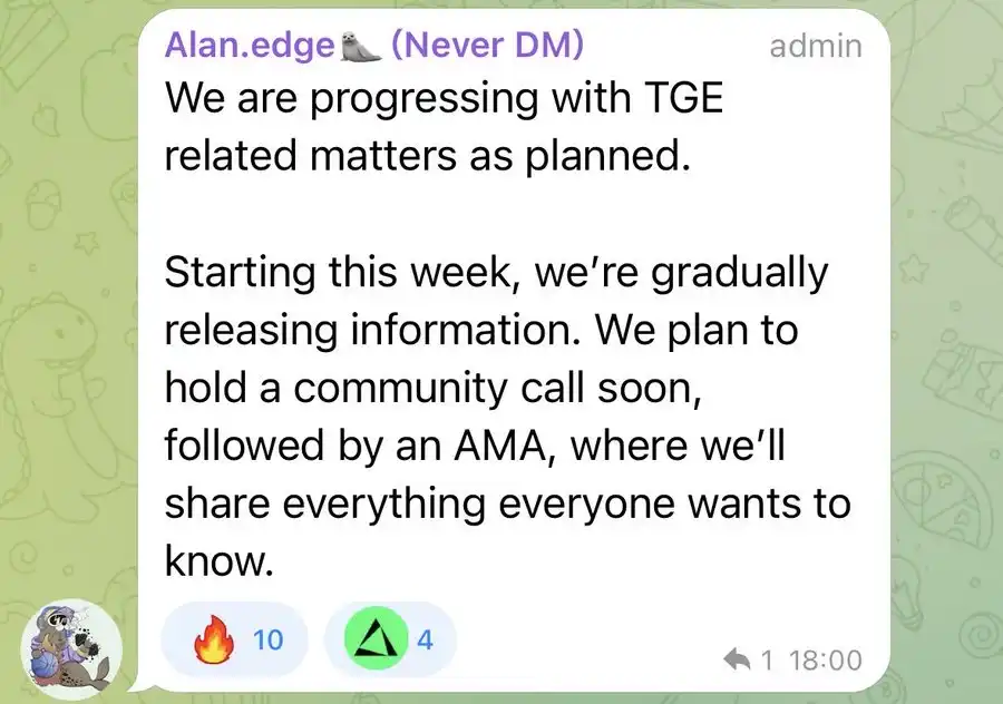 edgeX administrators further confirmed in the Telegram group that TGE-related matters are progressing as planned. Starting this week, the team will gradually disclose relevant information, and a community conference call and Q&A session will be held soon to fully inform users about the token economic model and distribution plan.