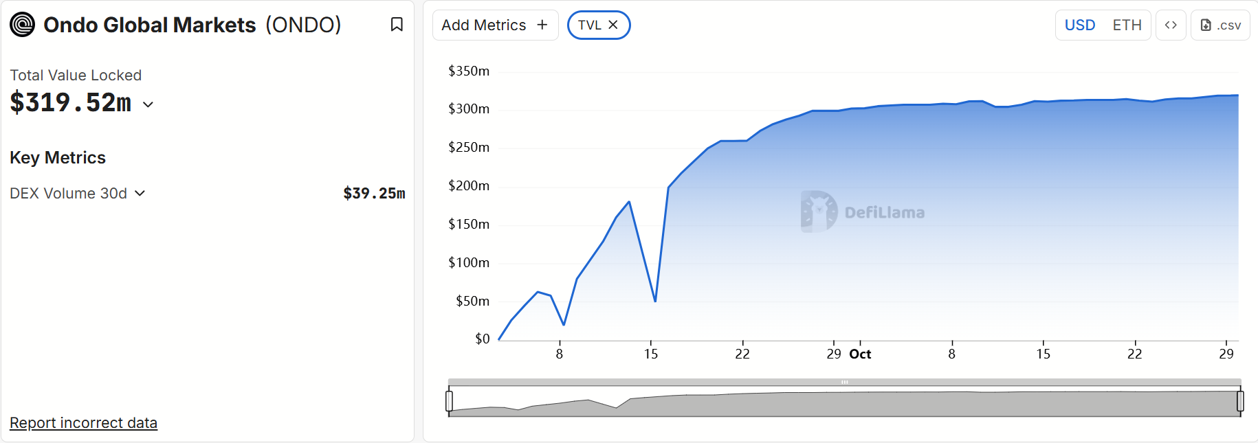 According to data from defillama.com, just 9 weeks after its launch, OGM's total locked assets (TVL) surged to $320 million, with cumulative on-chain trading volume exceeding $669 million, supporting over 100 tokenized U.S. stocks or ETFs, including the most representative assets like SPY, Apple, Tesla, NVIDIA, and QQQ.