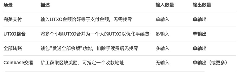 大部分交易都是 2 个输出,确实有只有一个输出的场景,总结如下: