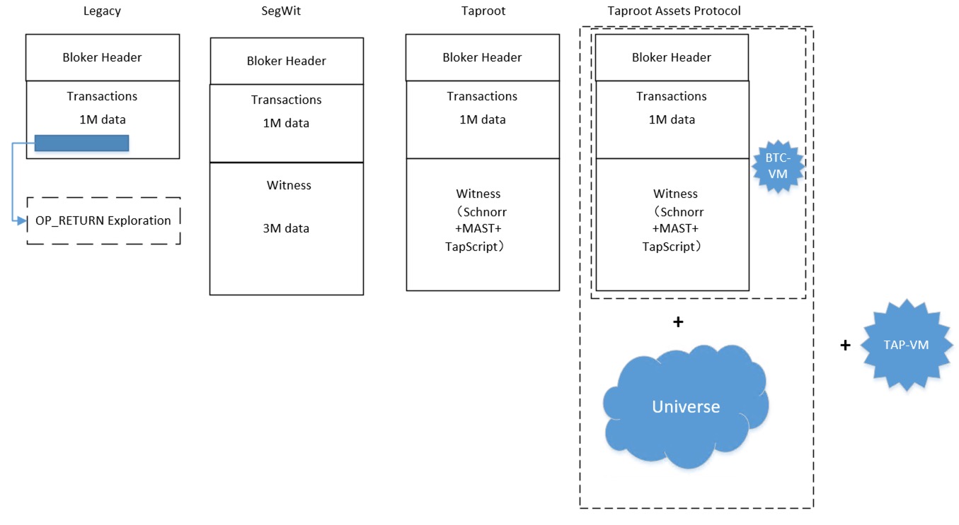 TaprootAssets 协议初始阶段是主要完成了比特币的扩容,通过 Univese 理论上把比特币可以使用的空间扩展到了无限。TAP 的 VM(Taproot Asset Script v1)也有了初步的模型,重要的是产生了一个隔离的,可以独立发展的 VM。在可以预见的发展后期,比特币都会在扩能方向上发展。