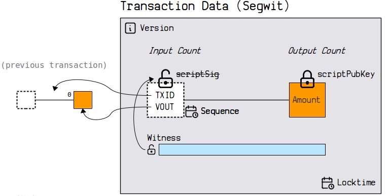 通过上图和原有的比特币交易图对比,增加了 Witness 部分的内容,这部分是的解锁代码。而且 Witness 部分的数据是存储在 1M 之外的扩展数据区里面。
