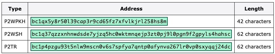 针对锁定脚本 P2WPKH 和 P2WSH 的格式如下说明,在这里也加上了隔离见证第二个版本 Taproot 的地址样例。