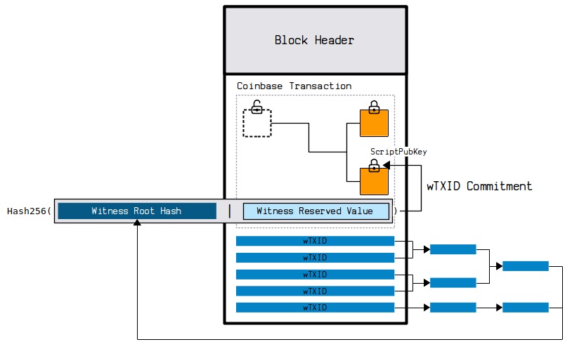 见证区中所有的交易 ID(wTXID)会通过哈希树形成一个根哈希提交到 coinbase 中,具体值的组合见示意图。