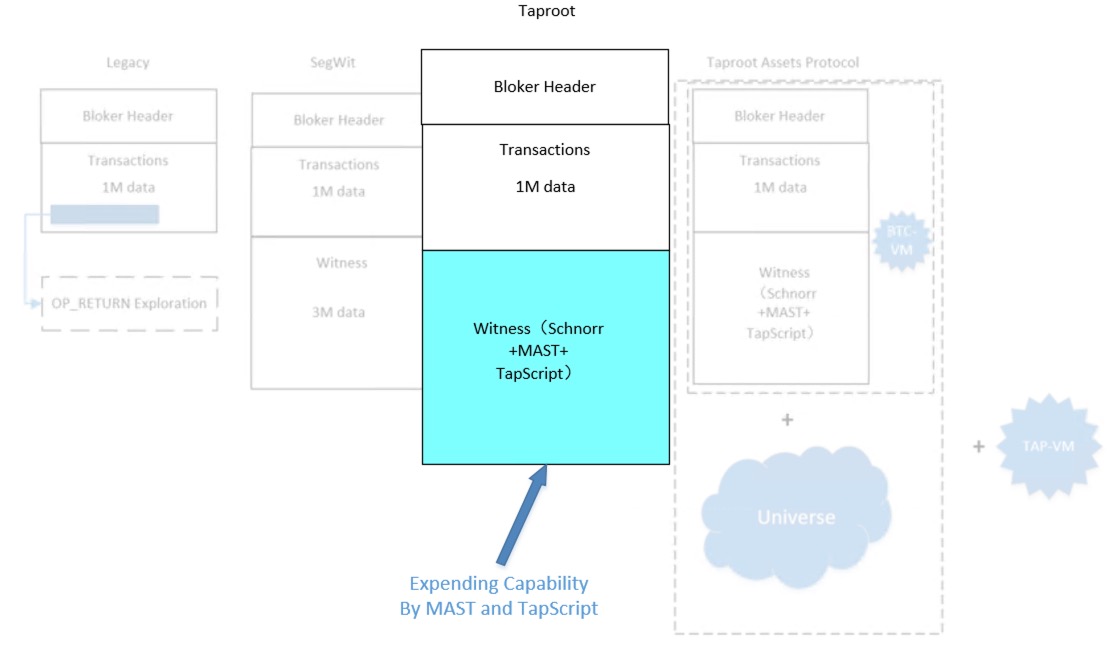 由隔离见证 Segwit 与 Taproot 的空间扩大,导致了 Schnorr、MAST 树和 Taproot Scripts 的产生,他们要完成的使命是比特币主网的功能扩大。