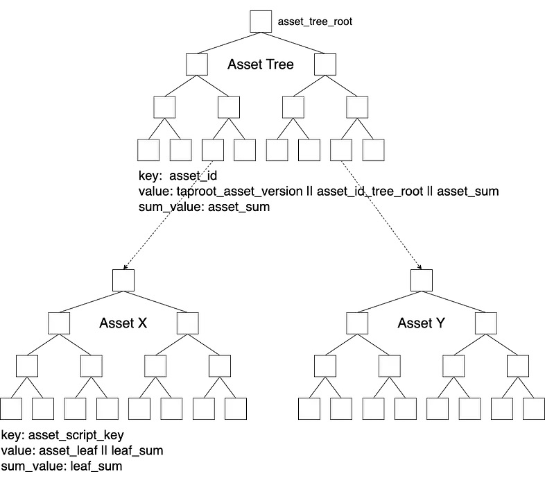 在当前的 Taproot Assets 协议中,使用稀疏默克尔求和树来解决资产相关的需求。