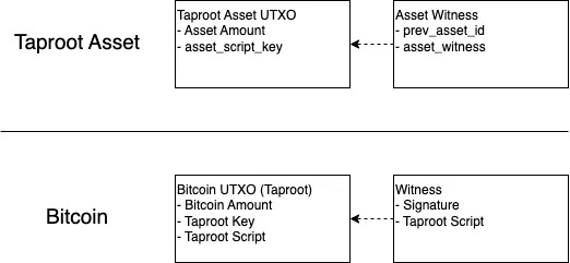 在花费一个 UTXO 时,首先要满足(外部的)比特币花费条件,然后是(内部的)TAP 花费条件,由 asset_script_key 指定,并且 asset_script_key 应该被 prev_asset_id 和 asset_witness 满足。举个例子,asset_witness 是被花费的 UTXO 的 asset_script_key 的签名。